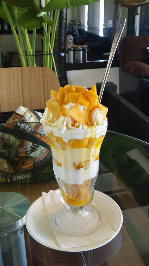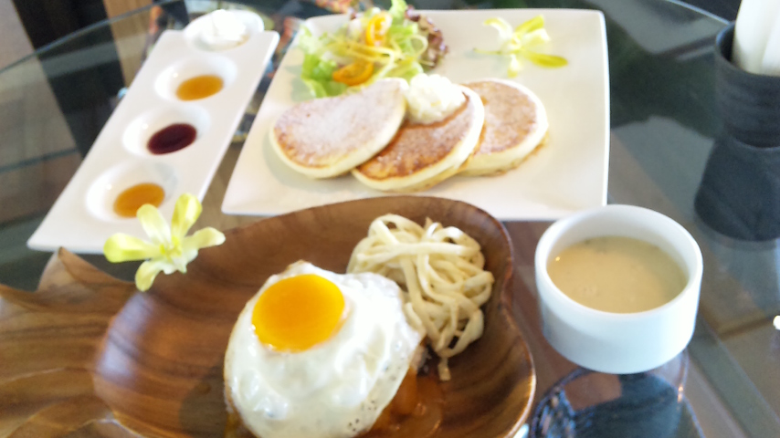 ラフテー、焼きおにぎり(飲み物はさんぴん茶)、マンゴーパフェ、パンケーキ&ロコモコ。